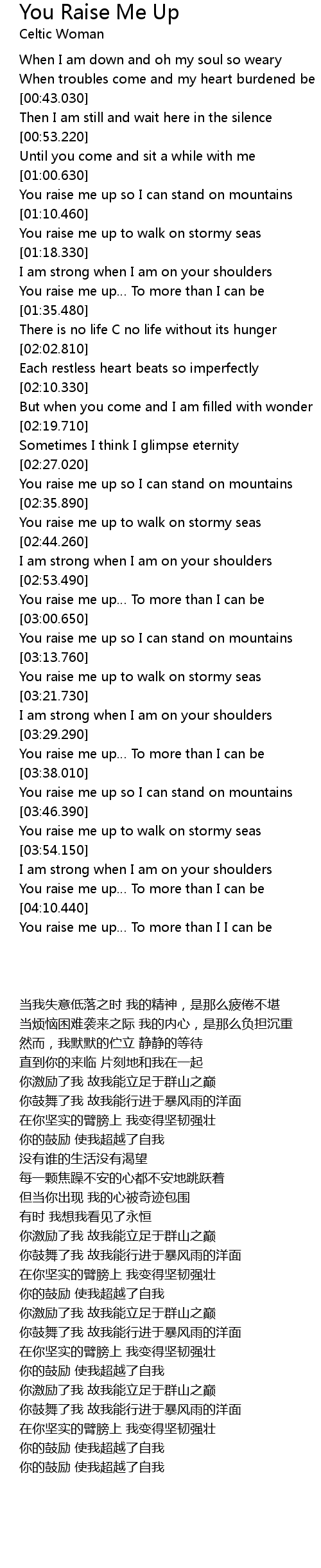 | [02:28.730] | You raise me up so I can stand on mountains |