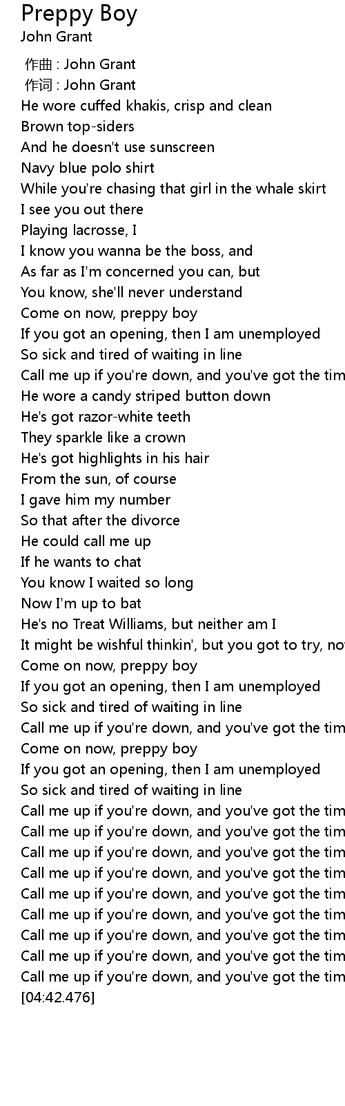 | [00:56.451] | He wore cuffed khakis, crisp and clean |