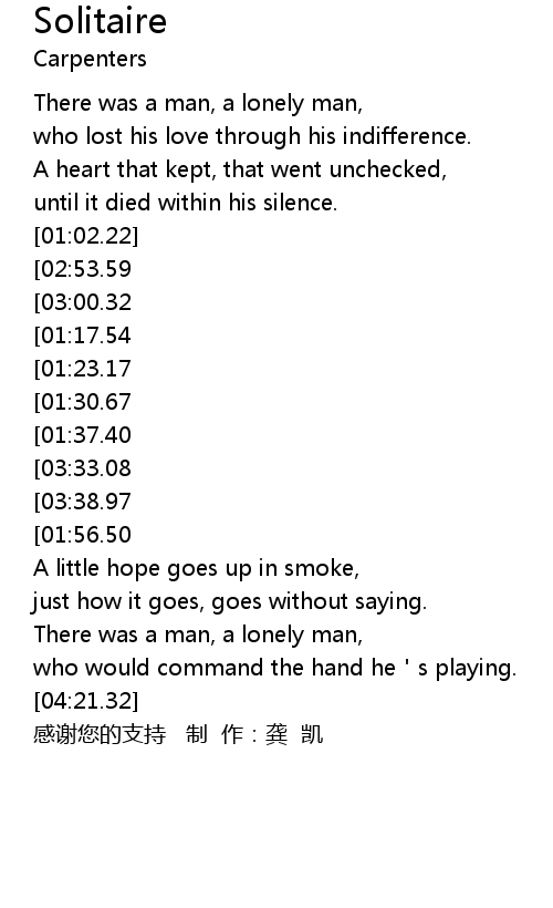 | [03:46.53][02:53.59][01:03.62] | And Solitaire's the only game in town, |
