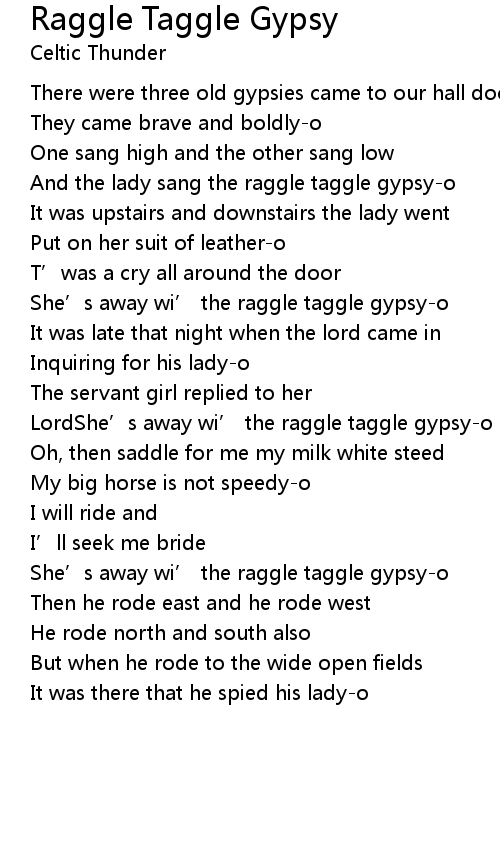 | She’s away wi’ the raggle taggle gypsy-o | |