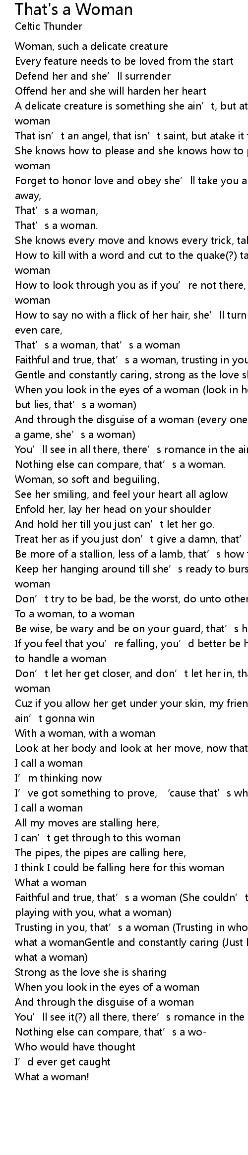 | Trusting in you, that' s a woman Trusting in who, you just haven' t a clue, what a womanGentle and constantly caring Just let it be this one' s for me, what a woman | |