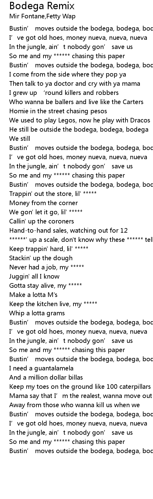 | [00:31.90] | Bustin' moves outside the bodega, bodega, bodega |