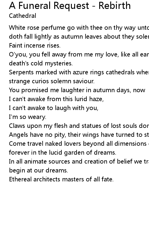 White rose perfume go with thee on thy way unto the thy shaded tomb low music doth fall lightly as autumn leaves about they solemn pall. |