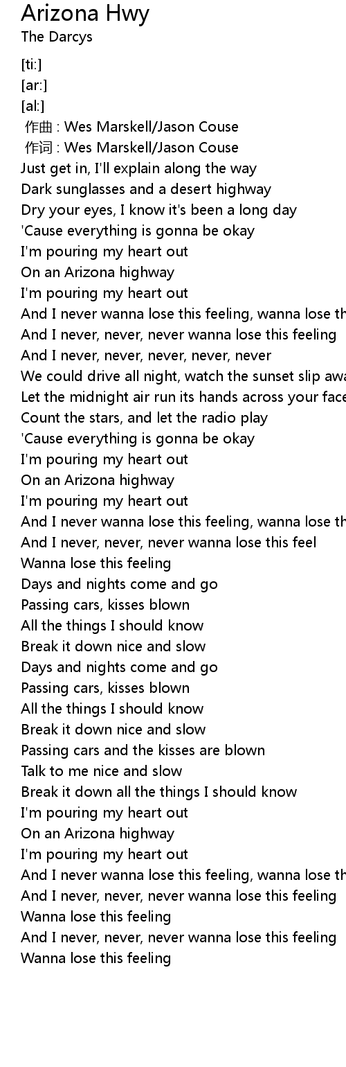 | [00:17.02] | Dark sunglasses and a desert highway |