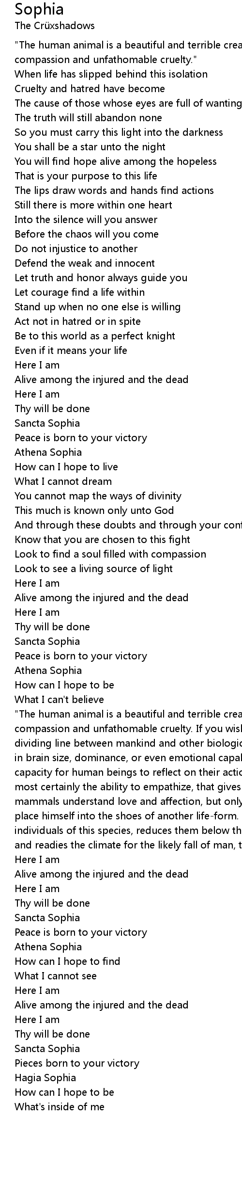 "The human animal is a beautiful and terrible creature, capable of limitless compassion and unfathomable cruelty. If you wish to find that which becomes the dividing line between mankind and other biological classifications, it rests not in brain size, dominance, or even emotional capability, but lies in the unique capacity for human beings to reflect on their actions and show regret, what is most certainly the ability to empathize, that gives them their position. All mammals understand love and affection, but only man shows the propensity to place himself into the shoes of another life-form. Losing this capability, among individuals of this species, reduces them below their much heralded position, and readies the climate for the likely fall of man, the fall from grace." |