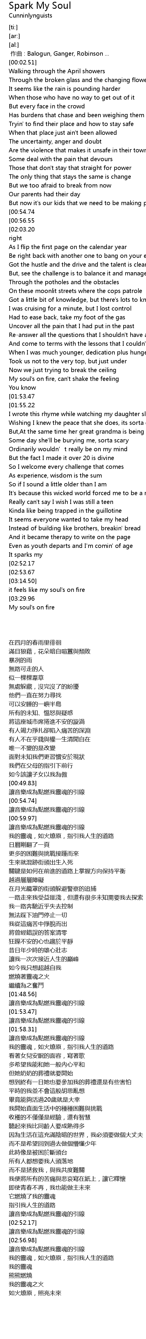 | [02:00.13][01:55.22][01:50.36] | Let the music be the fuse that will spark my soul |