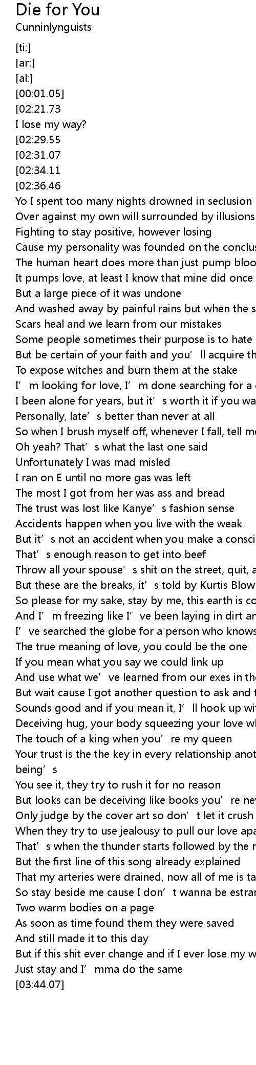 | [03:37.84][02:36.46][01:36.55][00:35.58] | If it would help I’d even die for you |