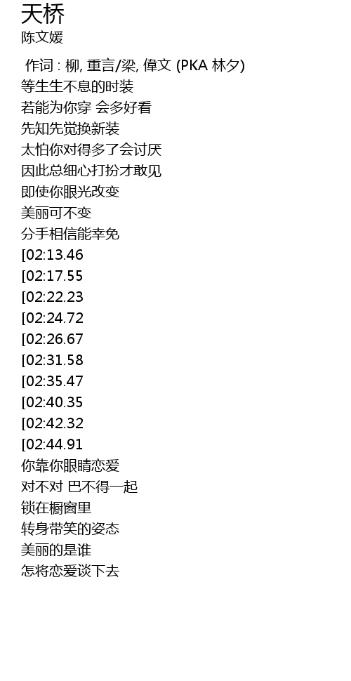 | [00:00.00] | 作词 : 柳, 重言/梁, 偉文 (PKA 林夕) |