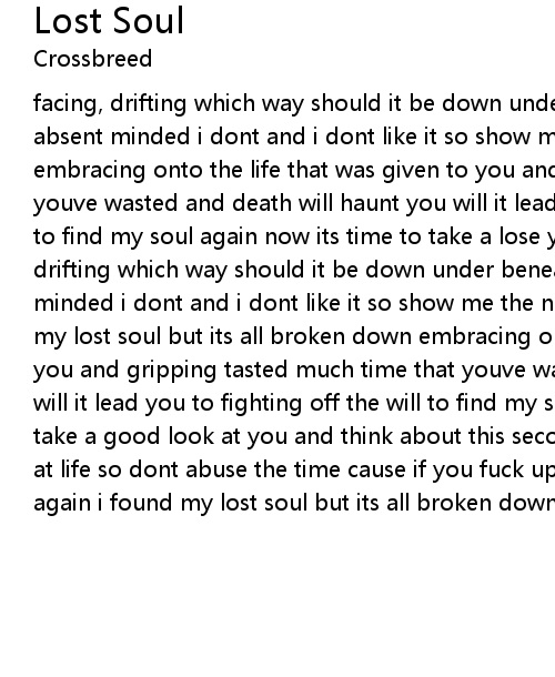 facing, drifting which way should it be down under beneath, the soul is lost now absent minded i dont and i dont like it so show me the new way to my soul embracing onto the life that was given to you and gripping tasted much time that youve wasted and death will haunt you will it lead you to fighting off the will to find my soul again now its time to take a lose your soul again facing drifting which way should it be down under beneath the soul is lost now absent minded i dont and i dont like it so show me the new way to my sould now i found my lost soul but its all broken down embracing onto the life that was given to you and gripping tasted much time that youve wasted and death will haunt you will it lead you to fighting off the will to find my soul again now its time to take a good look at you and think about this second chance that youve been given at life so dont abuse the time cause if you fuck up you will lose your soul again i found my lost soul but its all broken down |