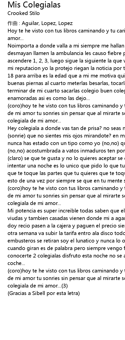 | (coro)hoy te he visto con tus libros caminando y tu carita de coqueta colegiala de mi amor tu sonries sin pensar que al mirarte solo por ti estoy sufriendo colegiala de mi amor...(3) | |