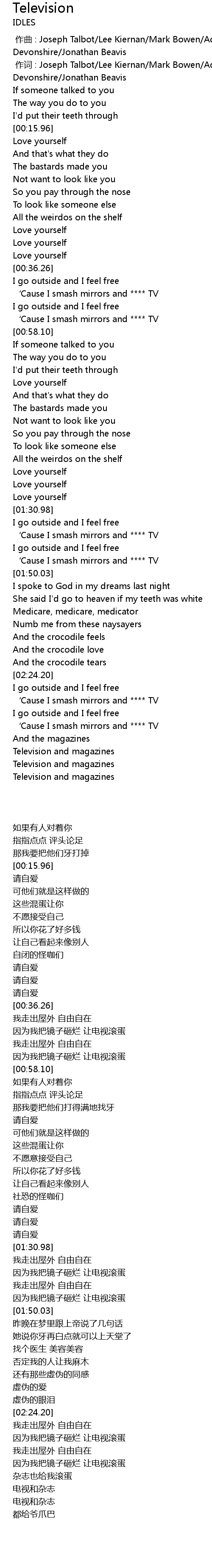 | [01:36.71] | ‘Cause I smash mirrors and **** TV |