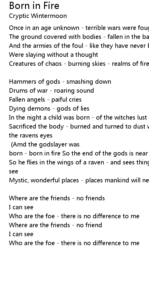 Roaming through the forest - flying above the sky [REF:] (Amd the godslayer was born - born in fire So the end of the gods is near - they will never survive) |