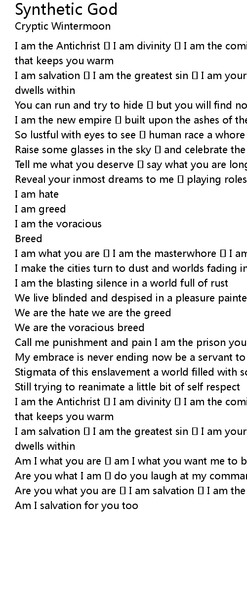 | I am salvation I am the greatest sin I am your synthetic god I am what dwells within | |