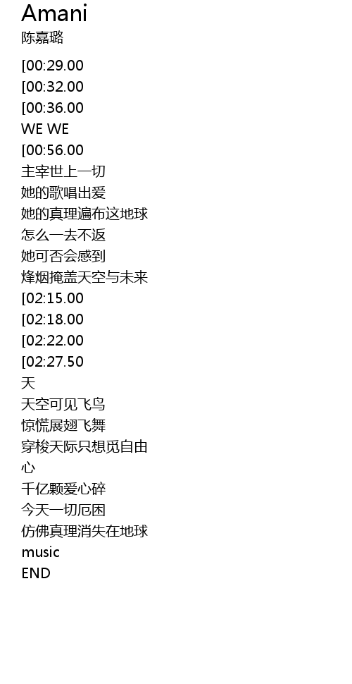 | [00:16.00][00:29.00][01:22.00][01:36.00][02:29.00][02:43.00][03:19.50][03:33.00][03:46.00][03:59.00][04:12.50] | AMANI |