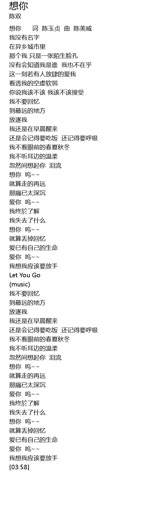 | [00:00] | 想你 词 陈玉贞 曲 陈美威 |