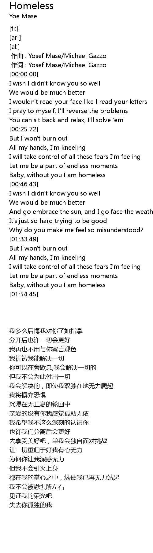 | [00:42.06] | Baby, without you I am homeless |