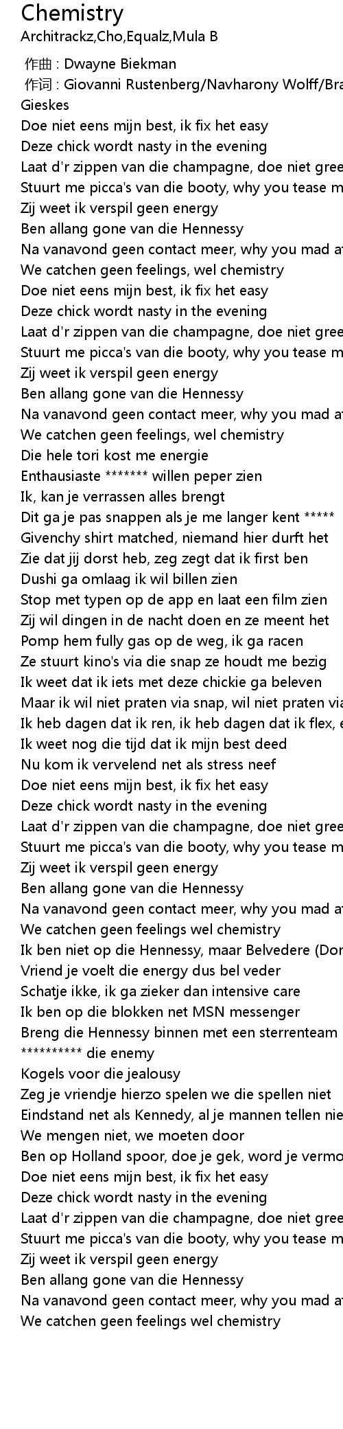 | [02:32.39] | We catchen geen feelings wel chemistry |