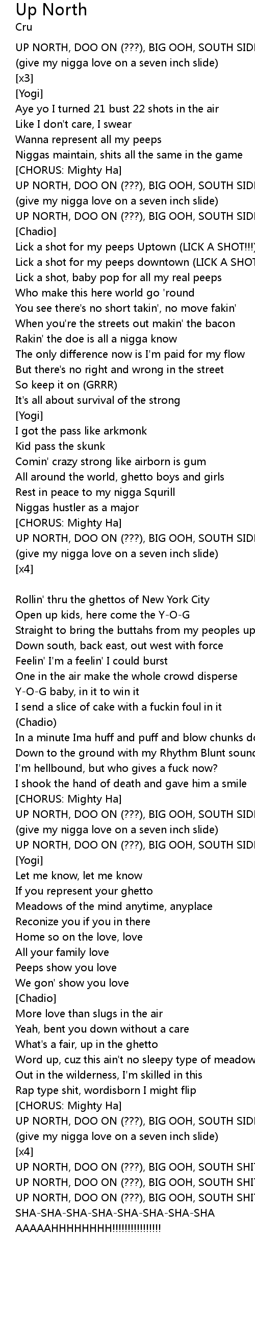 UP NORTH, DOO ON (???), BIG OOH, SOUTH SHIT!!!