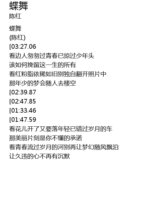 | [03:14.67][01:33.46] | 蝶舞是真实是梦幻是追逐 |
