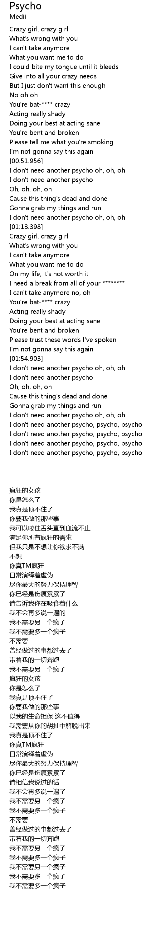 | [00:54.828] | I don't need another psycho oh, oh, oh |