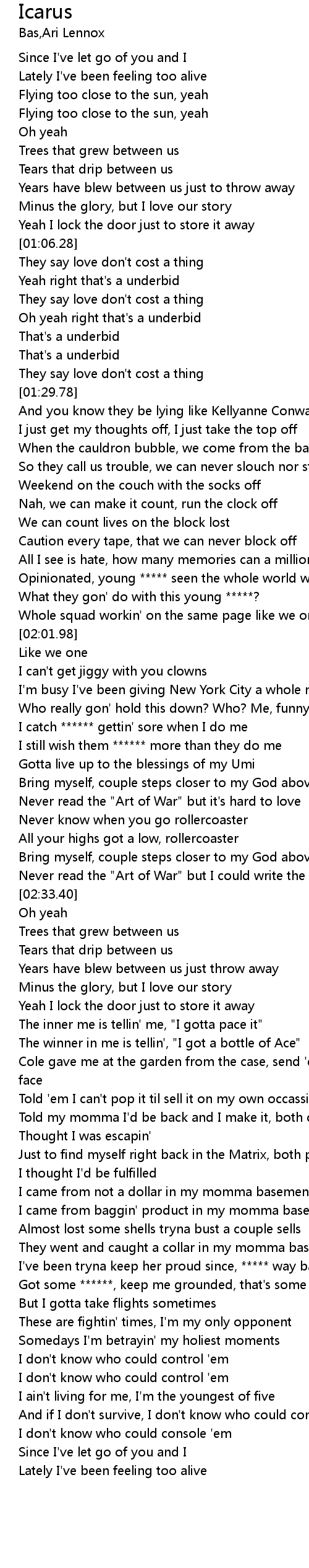 | [03:27.87] | Got some ******, keep me grounded, that's some way back |