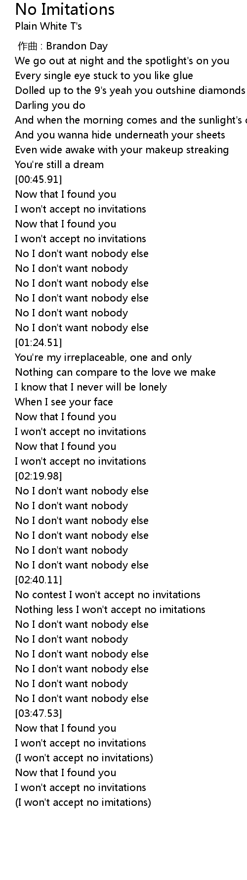 | [03:12.48] | Nothing less I won' t accept no imitations |