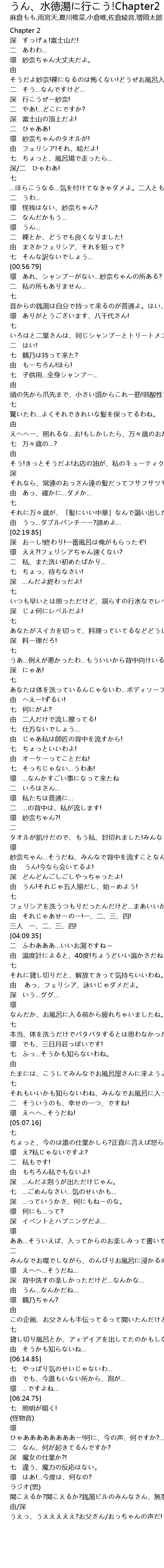 | [03:26.61] | 二 タオルが肌けだので、もう私、封切れました!みんなとのお風呂を、全力で楽しいみたいです! |