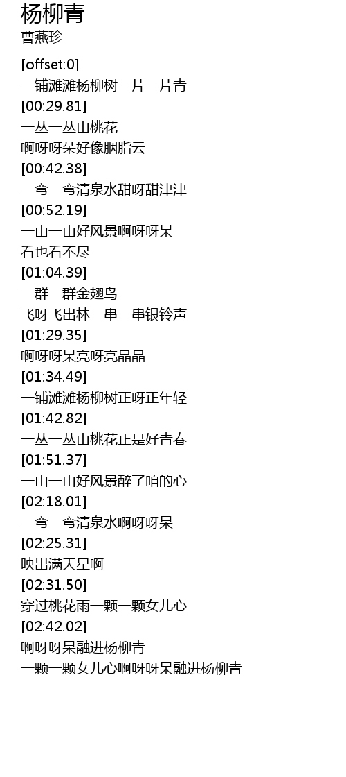 | [02:43.64] | ā yā ya dāi róng jìn yáng liǔ qīng yī kē yī kē nǚ ér xīn ā yā ya dāi róng jìn yáng liǔ qīng |
