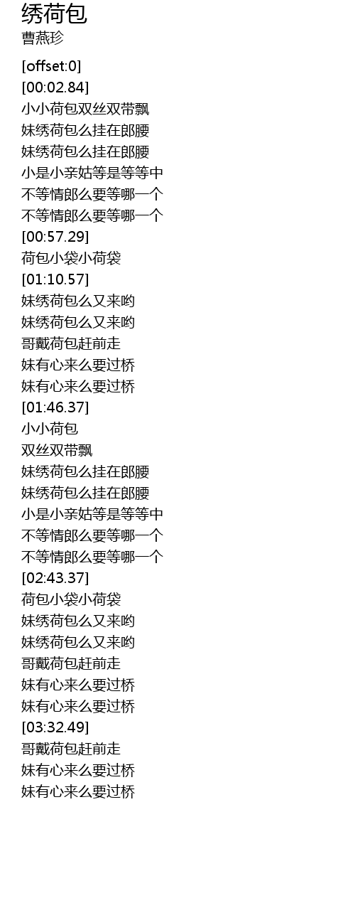 | [00:15.69] | 小小荷包双丝双带飘 |