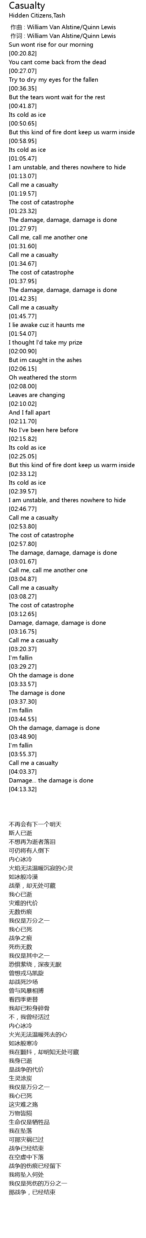 | [03:16.77] | Call me a casualty |