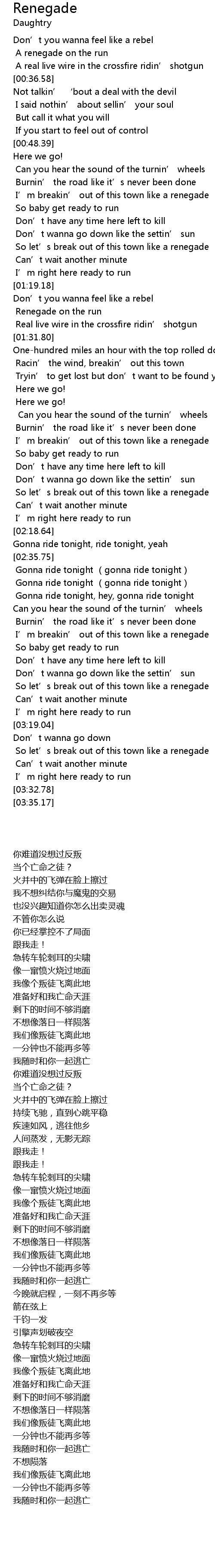 | [02:59.15] | I' m breakin' out of this town like a renegade |