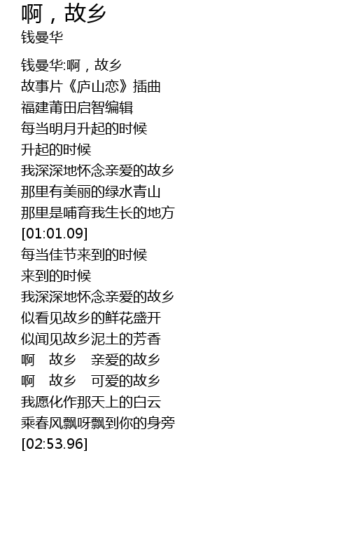 | [02:03.33] | 啊 故乡 亲爱的故乡 |