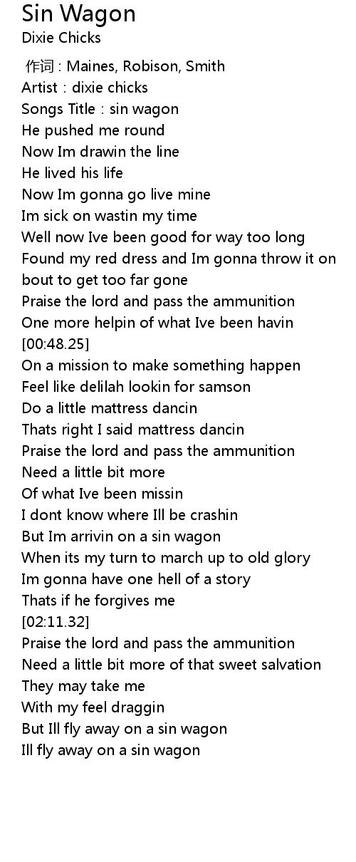 | [01:27.11] | But Im arrivin on a sin wagon |