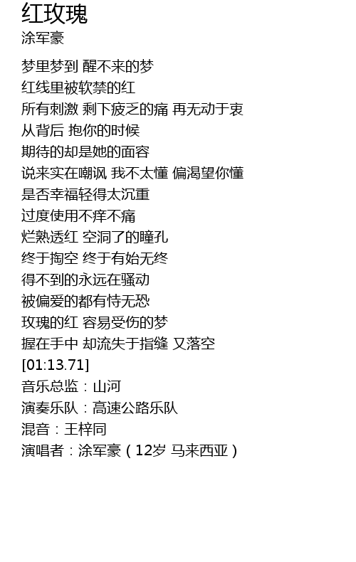 | [01:02.46] | 玫瑰的红 容易受伤的梦 |
