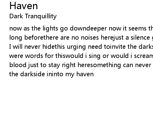 | I will never hidethis urging need toinvite the darkside ininto my havenif there were words for thiswould i sing or would i scream?i'd give my blood to staymy blood just to stay right heresomething can never sharethis urging need toinvite the darkside ininto my haven |