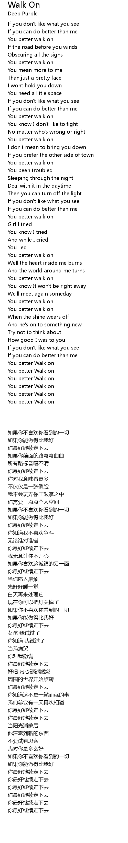 | [01:08.030] | You better walk on |