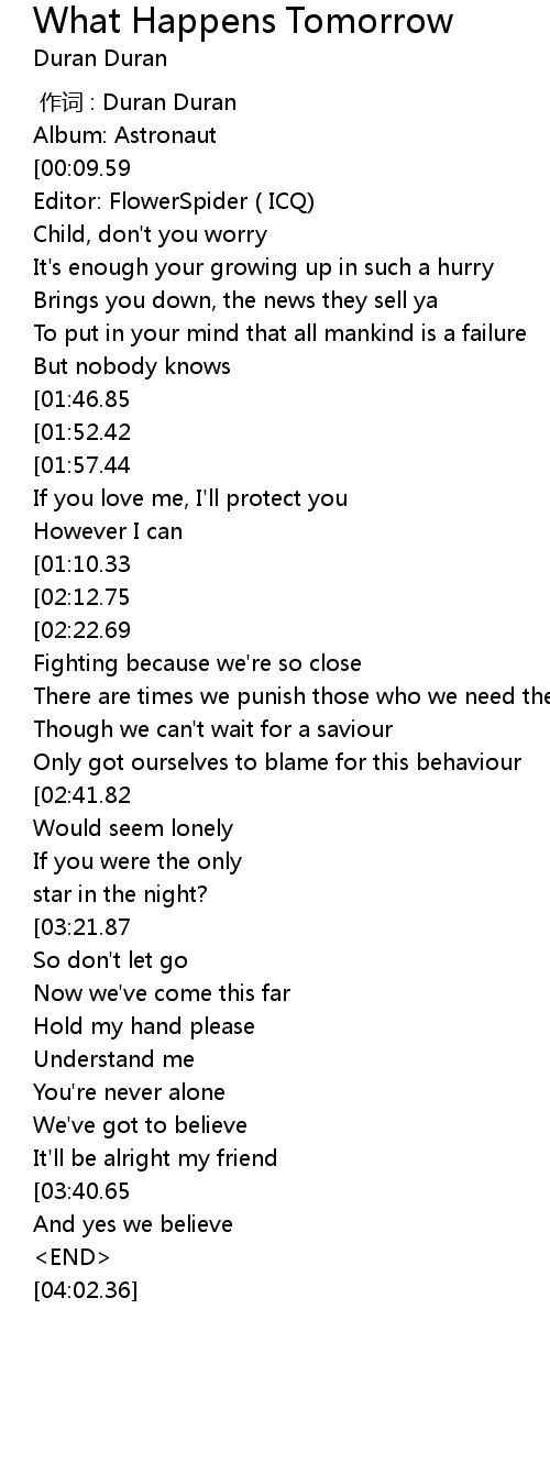 | [00:37.64][01:46.85][02:46.44] | What' s gonna happen tomorrow |