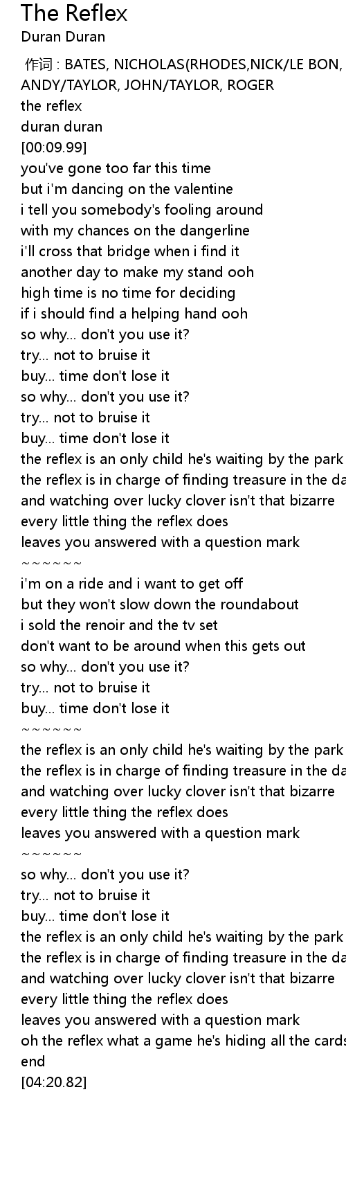| [02:40.84] | the reflex is an only child he' s waiting by the park |