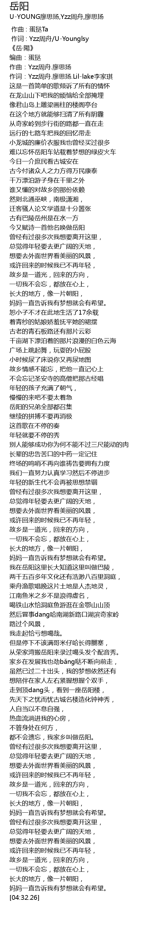 | [03:39.08] | 都不会遗忘,我家乡叫做岳阳。 |