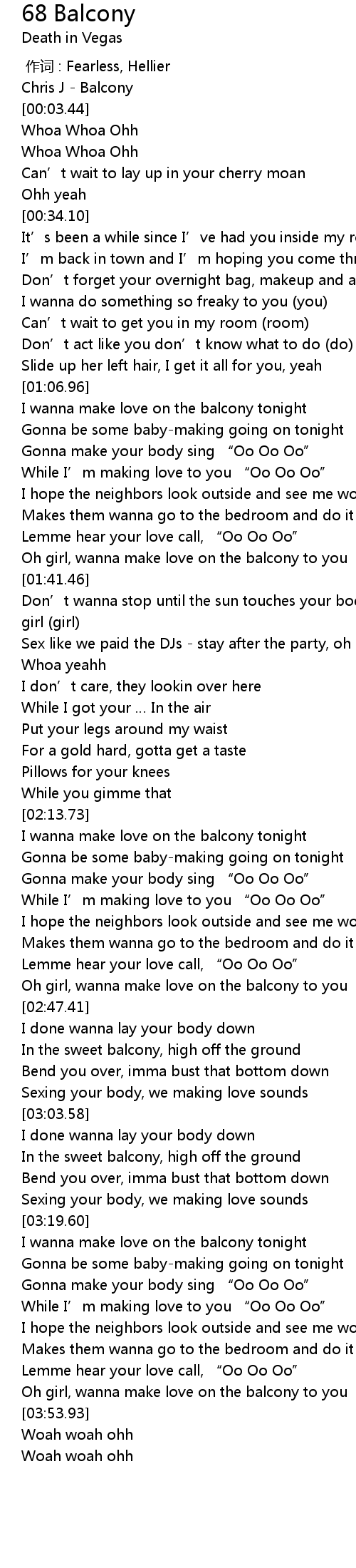 | [03:49.08] | Oh girl, wanna make love on the balcony to you |