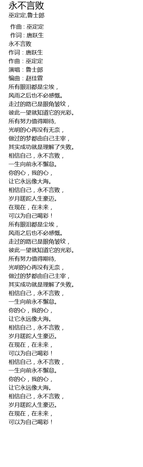 | [04:12.76] | xiāng xìn zì jǐ, yǒng bù yán bài, |