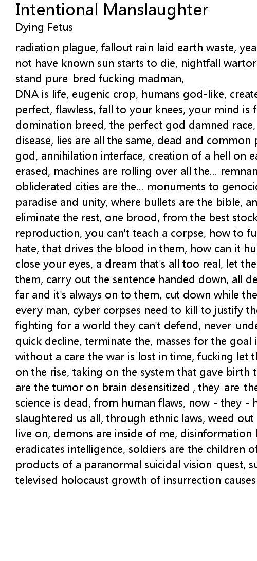 DNA is life, eugenic crop, humans god-like, created in a lab, high-priced, perfect, flawless, fall to your knees, your mind is fucking raped, the domination breed, the perfect god damned race, spreading of the seed, perpetual disease, lies are all the same, dead and common place, spitting in the face of god, annihilation interface, creation of a hell on earth, traces of your life erased, machines are rolling over all the... remnants of our fucking lives obliderated cities are the... monuments to genocide welcome to the century of paradise and unity, where bullets are the bible, and everyone's the enemy eliminate the rest, one brood, from the best stock, only to survive, initiates, reproduction, you can't teach a corpse, how to fucking live you can't know the hate, that drives the blood in them, how can it hurt, when you can not feel just close your eyes, a dream that's all too real, let the dead fall in front of them, carry out the sentence handed down, all dead again, cause they never get far and it's always on to them, cut down while they run, terror eats the soul of every man, cyber corpses need to kill to justify their plan, human cattle fighting for a world they can't defend, never-under-estimate, paralyzed hope in quick decline, terminate the, masses for the goal is death divine, execute without a care the war is lost in time, fucking let them die, modern day ape is on the rise, taking on the system that gave birth to test-tube life, now they are the tumor on brain desensitized , they-are-the-off-spring and children god, science is dead, from human flaws, now - they - have - conquered and, slaughtered us all, through ethnic laws, weed out the weak, only their kind can live on, demons are inside of me, disinformation leprosy, patriotic arrogance, eradicates intelligence, soldiers are the children of the existential atom bomb, products of a paranormal suicidal vision-quest, subversive paranoia through a, televised holocaust growth of insurrection causes massive unrelenting loss. |