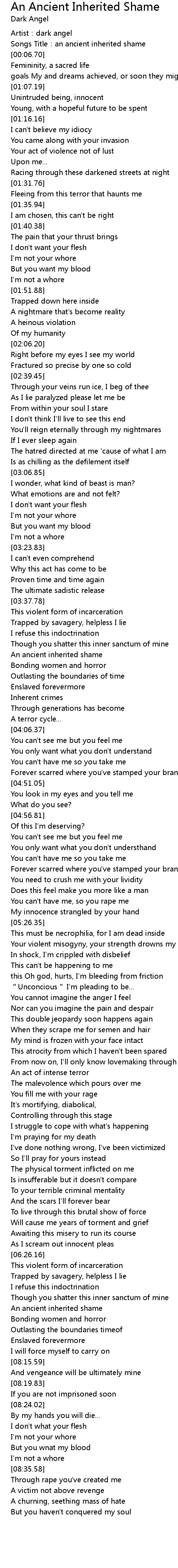 | [00:03.39] | Songs Title:an ancient inherited shame |