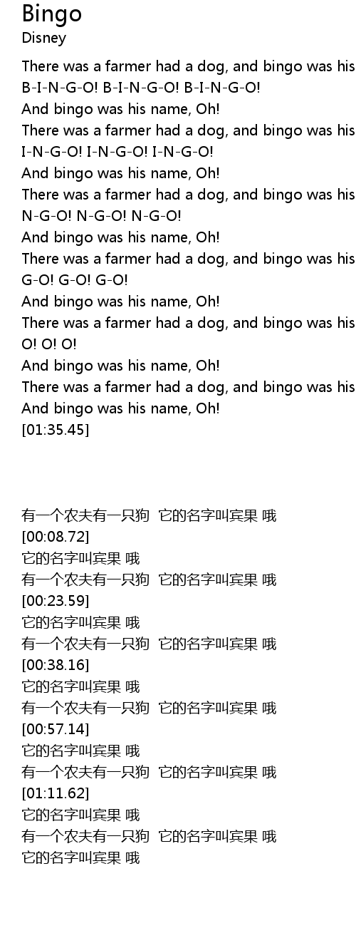 There was a farmer had a dog, and bingo was his name, OH! |