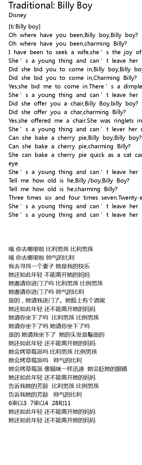 | [00:44.105] | Did she offer you a chair,Billy Boy,billy boy? |