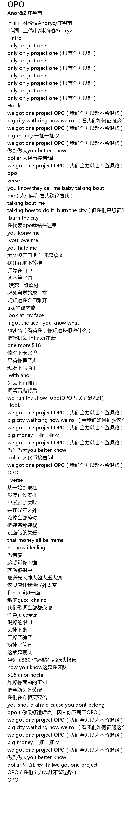 | [00:34.59] | we got one project OPO(我们全力以赴不留退路) |