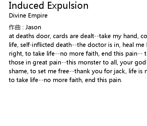 | at deaths door, cards are dealt--take my hand, come this way--time to take my life, self-inflicted death--the doctor is in, heal me help me die--have the right, to take life--no more faith, end this pain-- this angel for some, for those in great pain--this monster to all, your god is man made--no more of shame, to set me free--thank you for jack, life is now passed--have the right, to take life--no more faith, end this pain. |