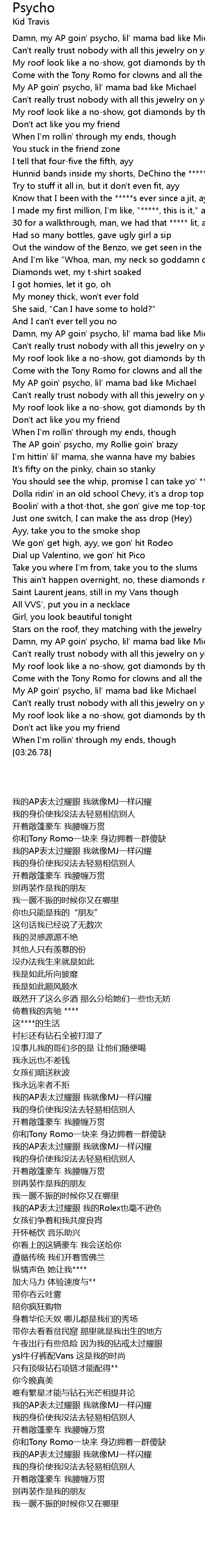 | [00:26.21] | My AP goin' psycho, lil' mama bad like Michael |