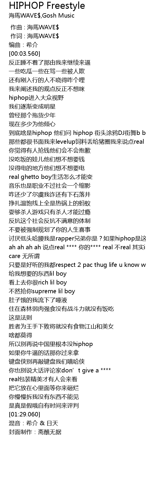 | [00:47.920] | 讨厌低头哈腰我是rapper兄弟你是?如果hiphop是这样子那要千万抵制 |