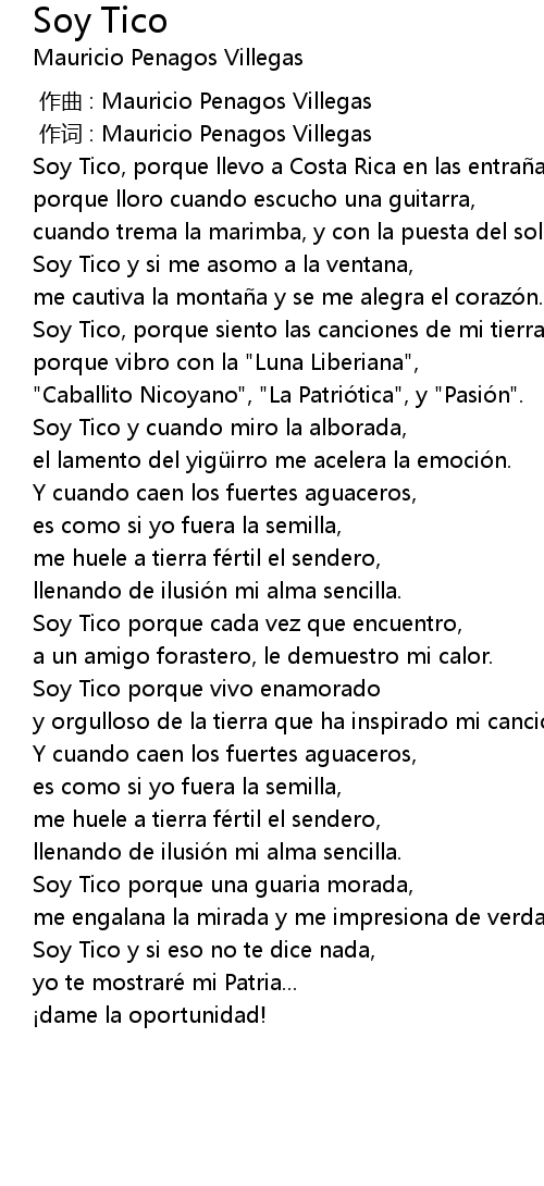 | [00:14.40] | Soy Tico, porque llevo a Costa Rica en las entrañas |